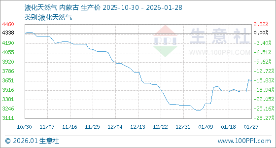 1月28日,生意社液化天然气基准价为3654.00元/吨,与本月初(3302.00元/吨)相比,上涨了10.66%。