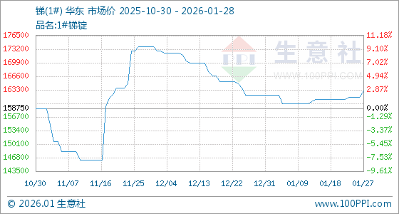 1月28日,生意社锑(1#)基准价为163000.00元/吨,与本月初(162000.00元/吨)相比,上涨了0.62%。
