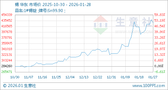 1月28日,生意社锡基准价为428770.00元/吨,与本月初(326340.00元/吨)相比,上涨了31.39%。