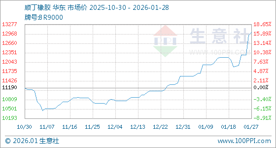 1月28日,生意社顺丁橡胶基准价为13020.00元/吨,与本月初(11580.00元/吨)相比,上涨了12.44%。