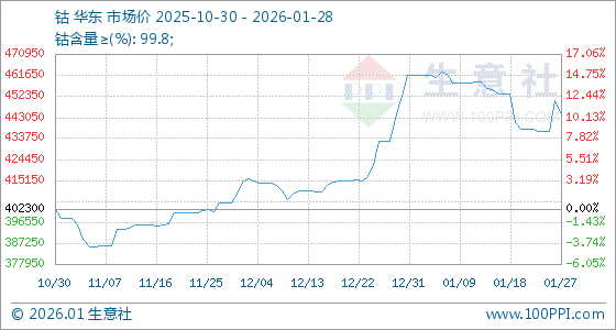 1月28日,生意社钴基准价为444400.00元/吨,与本月初(462100.00元/吨)相比,下降了3.83%。