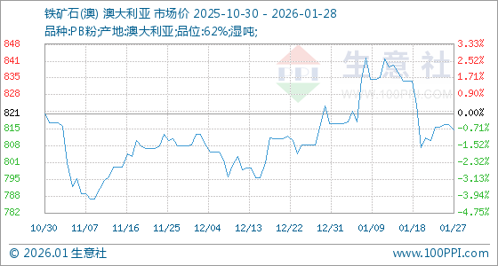 1月28日,生意社铁矿石(澳)基准价为814.78元/吨,与本月初(817.11元/吨)相比,下降了0.29%。