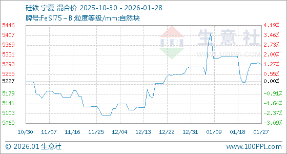 1月28日,生意社硅铁基准价为5294.29元/吨,与本月初(5285.71元/吨)相比,上涨了0.16%。