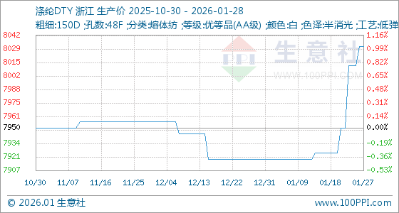 1月28日,生意社涤纶DTY基准价为8031.25元/吨,与本月初(7918.75元/吨)相比,上涨了1.42%。