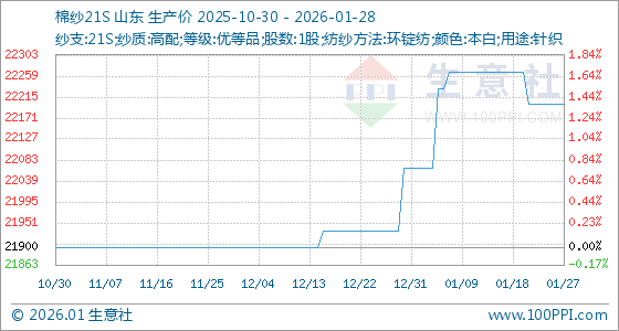 1月28日,生意社棉纱21S基准价为22200.00元/吨,与本月初(22066.67元/吨)相比,上涨了0.60%。
