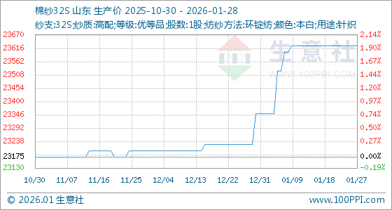 1月28日,生意社棉纱32S基准价为23625.00元/吨,与本月初(23350.00元/吨)相比,上涨了1.18%。