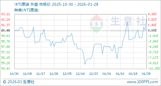 1月28日,生意社WTI原油基准价为60.63美元/桶,与本月初(57.95美元/桶)相比,上涨了4.62%。