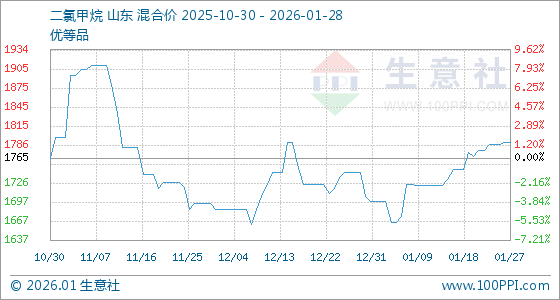 1月28日,生意社二氯甲烷基准价为1790.00元/吨,与本月初(1697.50元/吨)相比,上涨了5.45%。