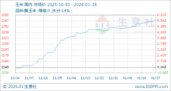 1月28日,生意社玉米基准价为2270.00元/吨,与本月初(2250.00元/吨)相比,上涨了0.89%。