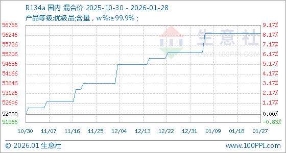 1月28日,生意社R134a基准价为56333.33元/吨,与本月初(55333.33元/吨)相比,上涨了1.81%。
