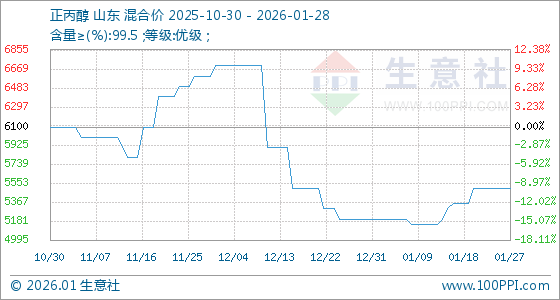 1月28日,生意社正丙醇基准价为5500.00元/吨,与本月初(5200.00元/吨)相比,上涨了5.77%。