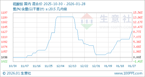 1月28日,生意社硫酸铵基准价为1133.33元/吨,与本月初(1046.67元/吨)相比,上涨了8.28%。