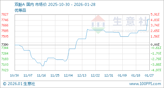 1月28日,生意社双酚A基准价为7760.00元/吨,与本月初(7576.00元/吨)相比,上涨了2.43%。