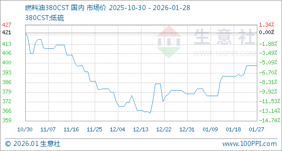 1月28日,生意社燃料油380CST基准价为398.50美元/吨,与本月初(378.50美元/吨)相比,上涨了5.28%。