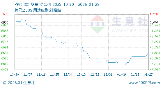 1月28日,生意社PP(纤维)基准价为6637.50元/吨,与本月初(6535.00元/吨)相比,上涨了1.57%。