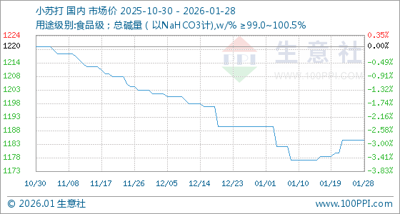 1月28日,生意社小苏打基准价为1185.00元/吨,与本月初(1190.00元/吨)相比,下降了0.42%。