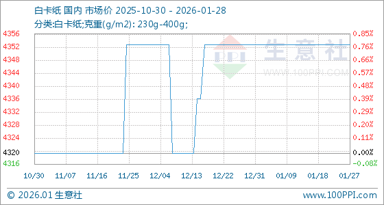1月28日,生意社白卡纸基准价为4353.33元/吨,与本月初持平。