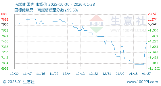 1月28日,生意社丙烯腈基准价为7450.00元/吨,与本月初(7500.00元/吨)相比,下降了0.67%。