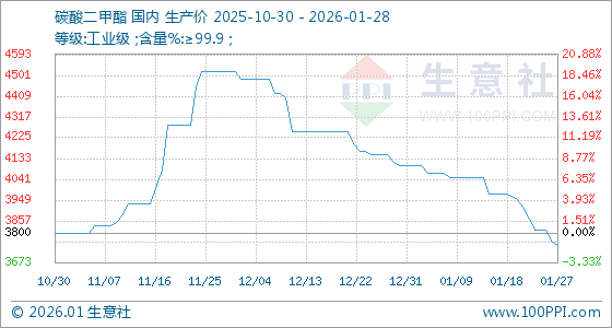 1月28日,生意社碳酸二甲酯基准价为3750.00元/吨,与本月初(4100.00元/吨)相比,下降了8.54%。