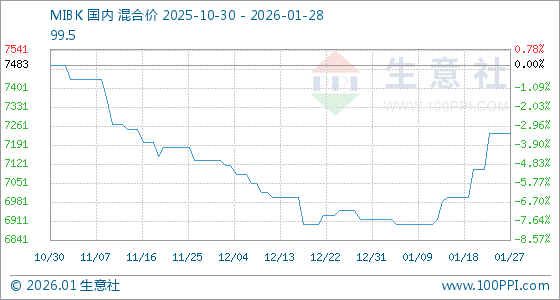 1月28日,生意社MIBK基准价为7233.33元/吨,与本月初(6916.67元/吨)相比,上涨了4.58%。
