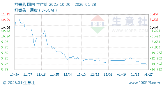 1月28日,生意社鲜香菇基准价为8.99元/公斤,与本月初(9.11元/公斤)相比,下降了1.32%。