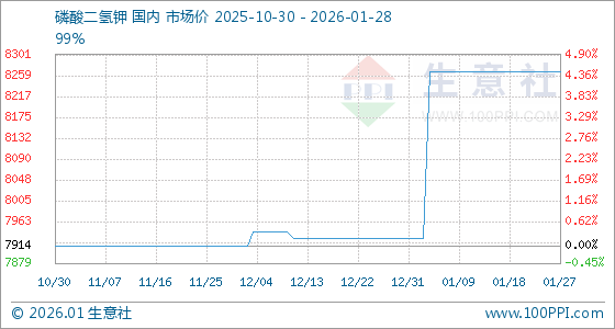 1月28日,生意社磷酸二氢钾基准价为8266.67元/吨,与本月初(7928.57元/吨)相比,上涨了4.26%。