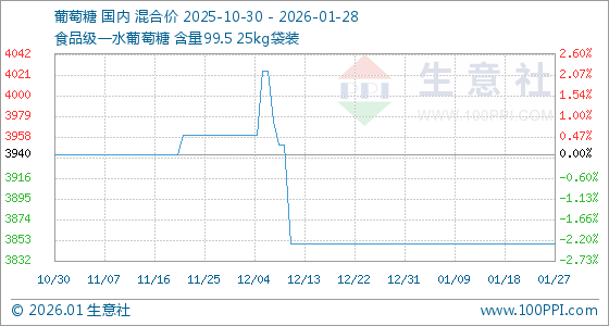 1月28日,生意社葡萄糖基准价为3850.00元/吨,与本月初持平。
