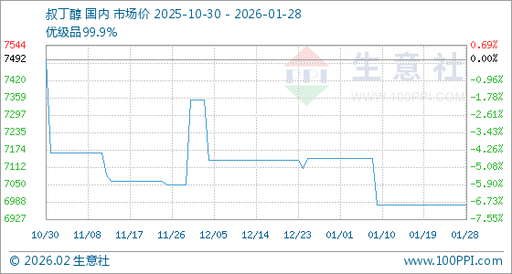 1月28日,生意社叔丁醇基准价为6978.57元/吨,与本月初(7141.67元/吨)相比,下降了2.28%。