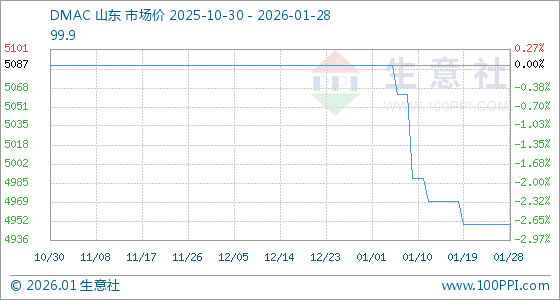 1月28日,生意社DMAC基准价为4950.00元/吨,与本月初(5087.50元/吨)相比,下降了2.7%。