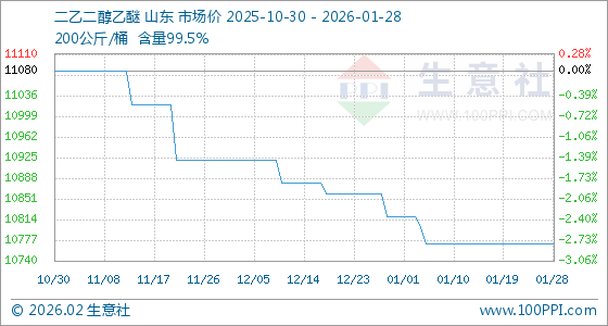 1月28日,生意社二乙二醇乙醚基准价为10771.43元/吨,与本月初(10820.00元/吨)相比,下降了0.45%。