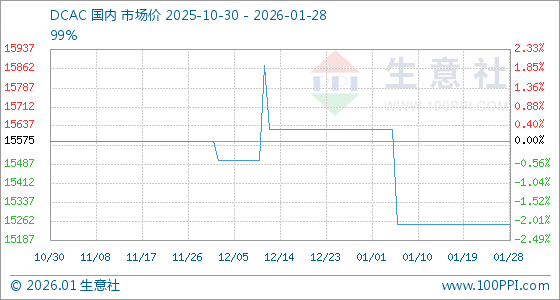 1月28日,生意社DCAC基准价为15250.00元/吨,与本月初(15625.00元/吨)相比,下降了2.4%。