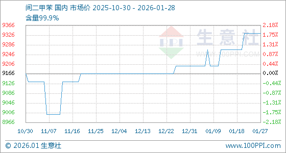 1月28日,生意社间二甲苯基准价为9333.33元/吨,与本月初(9200.00元/吨)相比,上涨了1.45%。