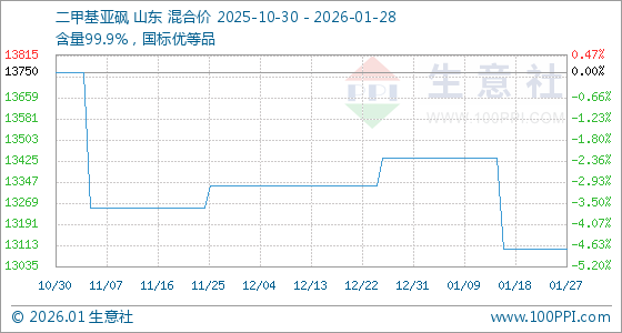 1月28日,生意社二甲基亚砜基准价为13100.00元/吨,与本月初(13433.33元/吨)相比,下降了2.48%。
