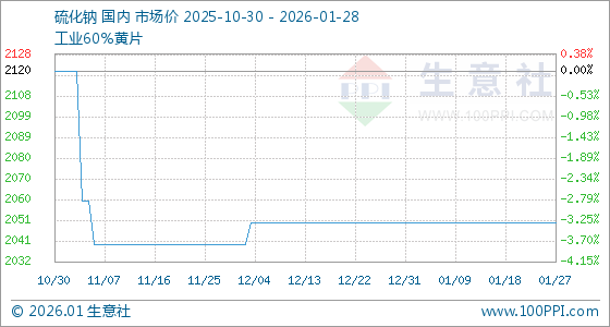 1月28日,生意社硫化钠基准价为2050.00吨,与本月初持平。
