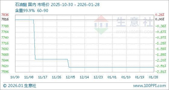 1月28日,生意社石油醚基准价为7616.67元/吨,与本月初持平。