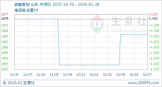 1月28日,生意社碳酸氢铵基准价为1866.67元/吨,与本月初(1850.00元/吨)相比,上涨了0.90%。