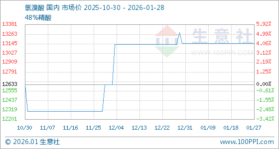 1月28日,生意社氢溴酸基准价为13150.00元/吨,与本月初持平。