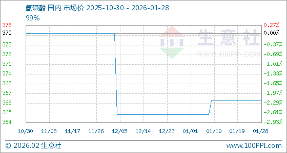 1月28日,生意社氢碘酸基准价为366.67元/吨,与本月初(365.00元/吨)相比,上涨了0.46%。