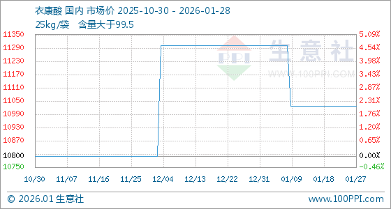 1月28日,生意社衣康酸基准价为11025.00元/吨,与本月初(11300.00元/吨)相比,下降了2.43%。