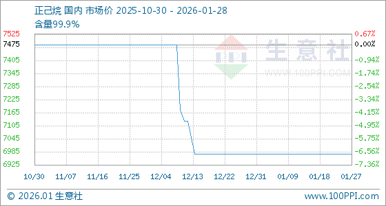 1月28日,生意社正己烷基准价为6975.00元/吨,与本月初持平。