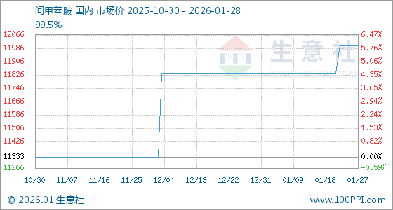 1月28日,生意社间甲苯胺基准价为12000.00元/吨,与本月初(11833.33元/吨)相比,上涨了1.41%。