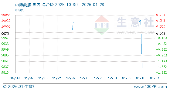 1月28日,生意社丙烯酰胺基准价为9833.33元/吨,与本月初(10025.00元/吨)相比,下降了1.91%。