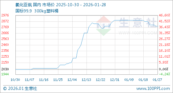 1月28日,生意社氯化亚砜基准价为2790.00元/吨,与本月初(2890.00元/吨)相比,下降了3.46%。