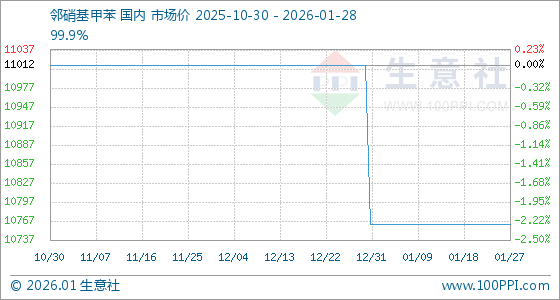 1月28日,生意社邻硝基甲苯基准价为10762.50元/吨,与本月初持平。