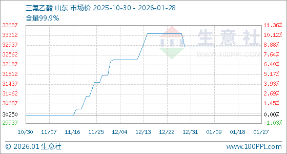 1月28日,生意社三氟乙酸基准价为32875.00元/吨,与本月初持平。