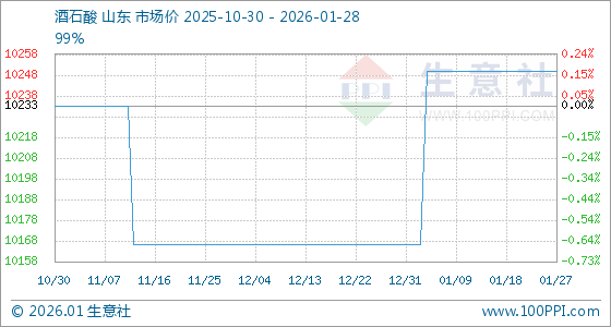 1月28日,生意社酒石酸基准价为10250.00元/吨,与本月初(10166.67元/吨)相比,上涨了0.82%。
