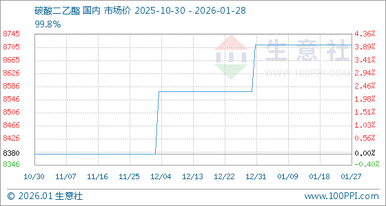 1月28日,生意社碳酸二乙酯基准价为8712.50元/吨,与本月初持平。