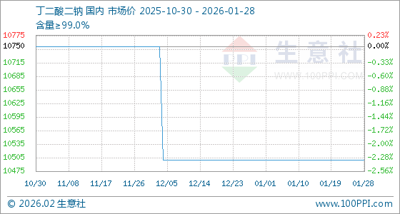 1月28日,生意社丁二酸二钠基准价为10500.00元/吨,与本月初持平。