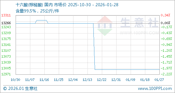 1月28日,生意社十六酸(棕榈酸)基准价为13000.00元/吨,与本月初持平。