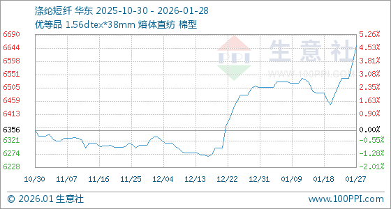 1月28日,生意社涤纶短纤基准价为6651.95元/吨,与本月初(6507.33元/吨)相比,上涨了2.22%。